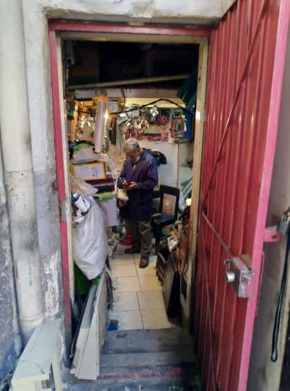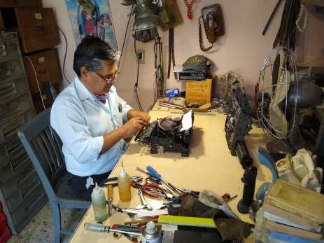 El día de la entrevista llegué al taller del maestro Curi antes que él, lo que me dio tiempo de tomar algunas fotografías y maravillarme, de nuevo, con las máquinas de escribir completas y para partes distribuidas en un espacio tan pequeño, tanto que las tres personas que laboran en el lugar deben sacar las máquinas para liberar el espacio de su mesa y poder trabajar. En el taller están el maestro Curi, reparador de todo tipo de máquinas de escribir, el señor Coria, quien compone, en especial, máquinas de escribir electrónicas e impresoras; y Lucio, que arregla calculadoras y máquinas de escribir eléctricas.